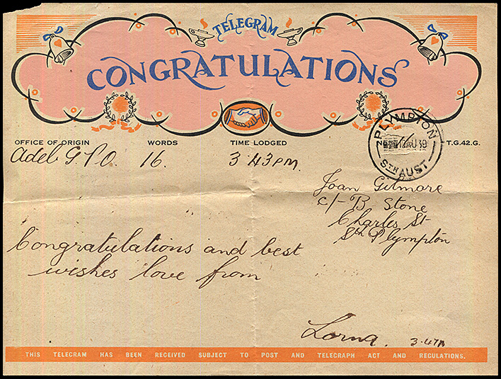 Broken Hill to Goodwood, SA. (21 December 1940 - from the accompanying telegram).