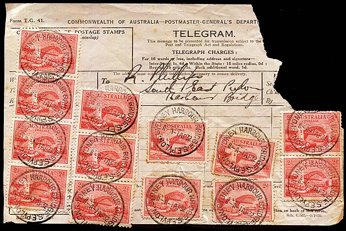 AB-TO-6. 1 April 1932 with the Sydney Harbour Bridge cancellation for the S.E Pylon. Transmission form used during the period celebrating the opening of the Sydney Harbour Bridge. No message was required. Used on the second last day of the special postal arrangements on the Bridge. Extraordinary survivor as such a form would have been retained and later destroyed by the PMG officials. |