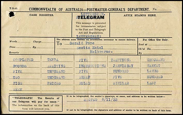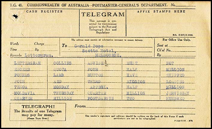 | TO-7A | None | 8 November 1933 - copy of a lettergram to Melbourne. | RRRR |