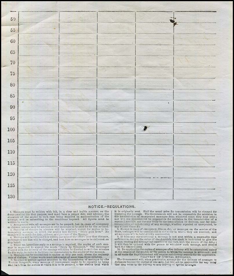 This form appears to have been issued in mid-1876. The Age (24 June 1876, p.5) noted, in reporting on New South Wales news, that "the Postmaster-General has directed the issue of new forms, by which delay in transmission will be detected". Hence entries were provided in the heading to record times RECEIVED and SENT.