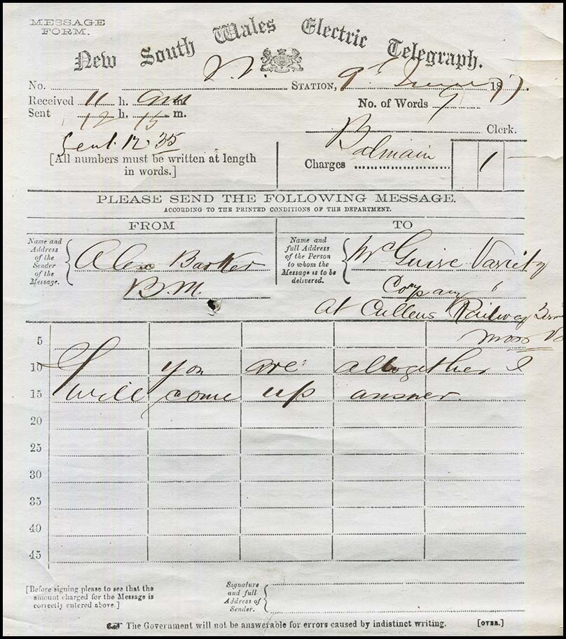 In the Legislative Council on 22 June 1876, Mr. Docker said, in answer to a question, that new transmission forms for telegraphic messages would be issued on the 1st July. The time a message was received for transmission or the time it was issued for delivery would be recorded. No more of the forms now in use were to be printed. The Sydney and suburban offices and the country offices would be supplied as soon as the forms could be furnished by the Government printer and distributed.