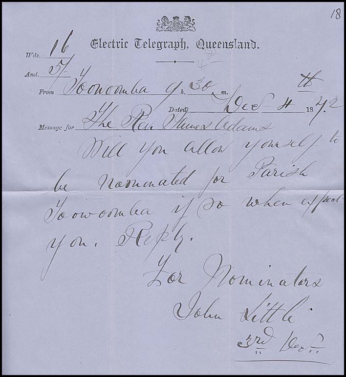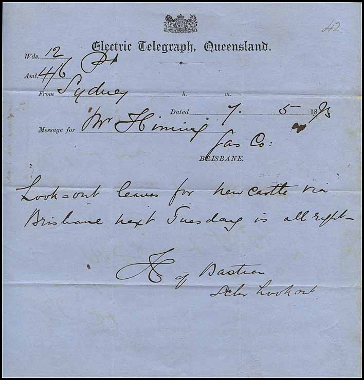 Probably QC-DC-3: Intercolonial telegram from Sydney to Brisbane Wednesday 7 May 1875 (?)