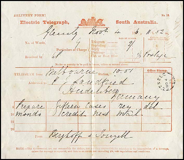 Very early usage of a hand stamp on a telegram. Also earliest recorded example of an Australian telegram crossing the Overland Telegraph line (4 years after opening). Earlier forms with messages transiting the Australian Colonies are included elsewhere elsewhere.