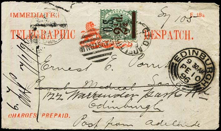 SC-EO-5. Used delivery envelope - Cover is franked with a thin 'O.S.' Narrow Setting Overprint De La Rue Perf 10 '2½d.' on 4d blue-green and tied by GPO ADELAIDE duplex, Largely superb 'EDINBURGH/FE10/96/ 5 ' arrival cds. Has unclear TELEGRAPH OFFICE date stamp in TLC. |