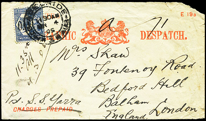 SC-EO-5. Used 31 August 1898. Arrival backstamp for London 3 October 1898. Used delivery envelope. Characteristics: