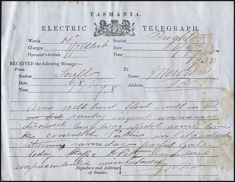 There are many examples of COLLECT telegrams for Tasmania. Some of these are on ad hoc forms while others are on the printed transmission forms and delivery forms.