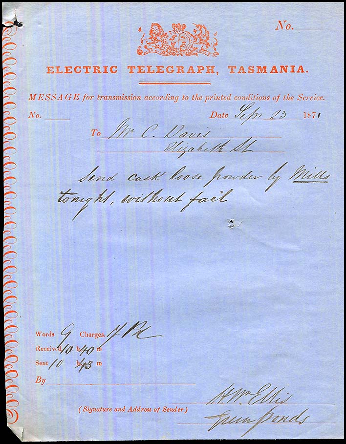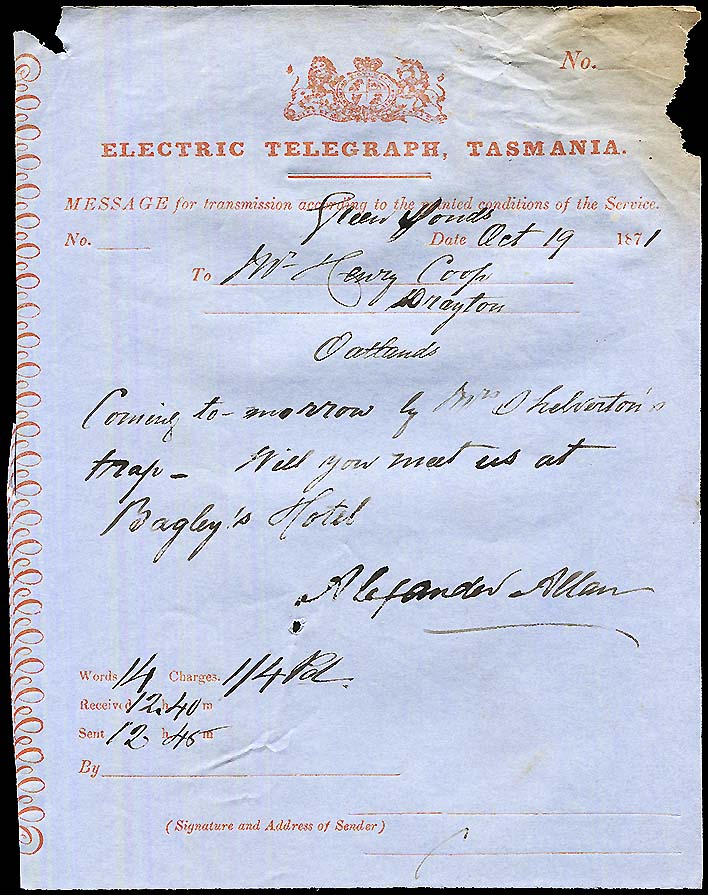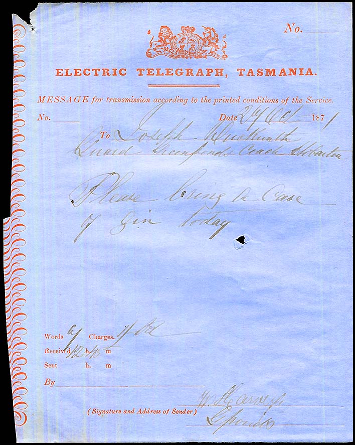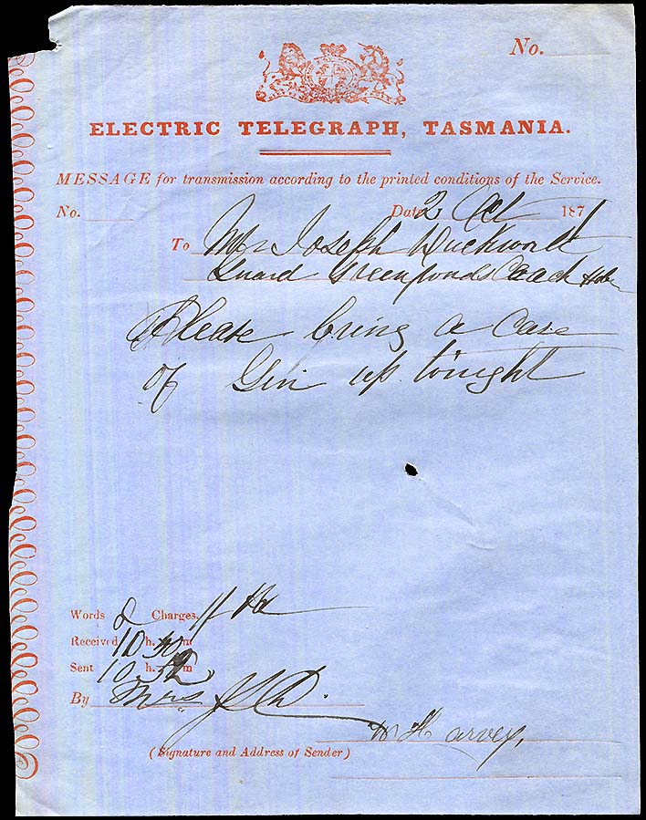 Telegram sent from Greenponds Greenponds (W. Harvey) to Hobarton (Joseph Duckwoorth, Guard Greenponds Coach, Hobarton).