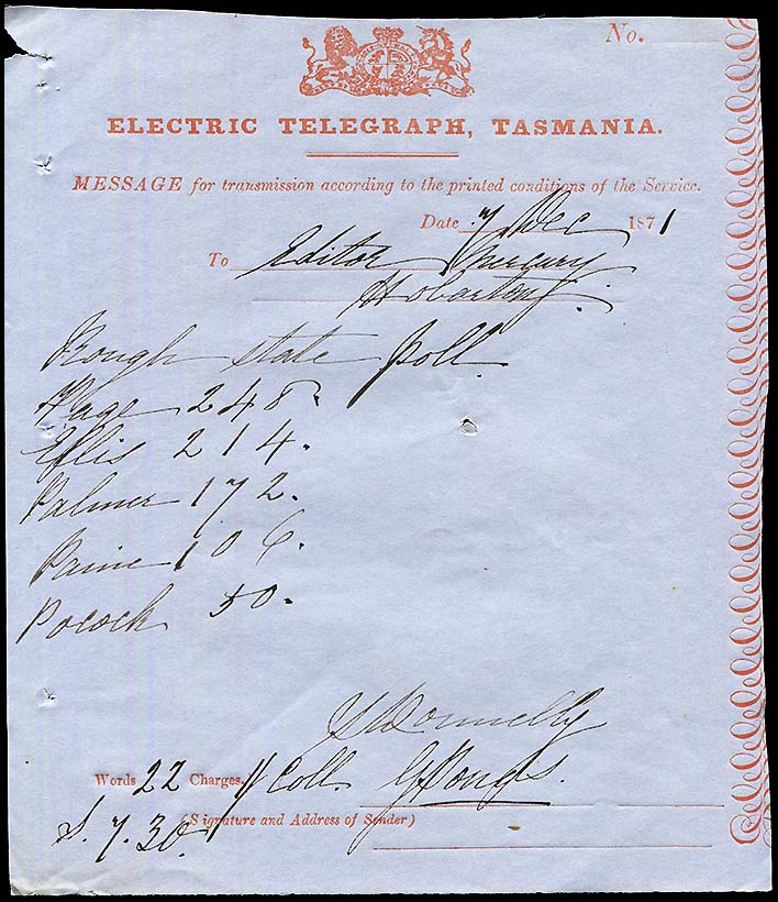 | Heading and notes: | No form number. Heading is ELECTRIC TELEGRAPH, TASMANIA below a 39 mm wide crest. |
