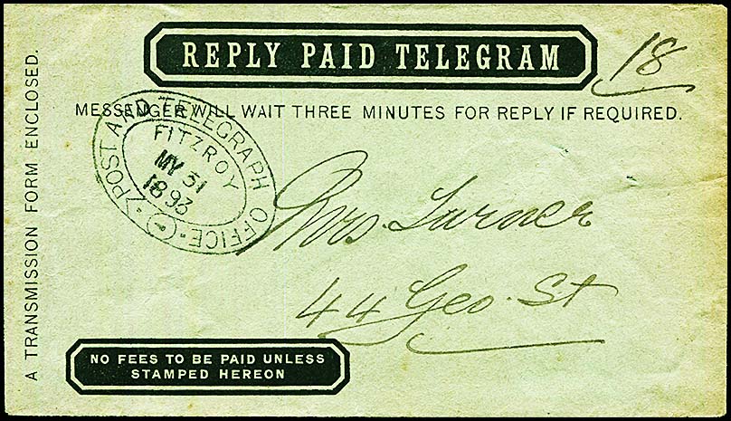 ![]() This Reply Paid envelope was used at Fitzroy on 31 May 1893 - about two months after the Regulation was announced. |