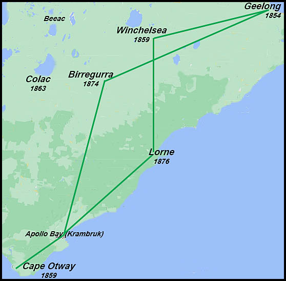 In reply to a question from Subscriber last week, a Geelong correspondent kindly supplies the following information: Assuming him to be a resident on the Melbourne side, he must start from this place and go via Birregurra on the Colac Road thence over Mount Sabine to Apollo Bay and along the coast track. He cannot practically follow the telegraph line. The track from Mount Sabine to Apollo Bay is only open for cattle not conveyances. The distances are, as we learn from another informant, from Birregurra to Gherangmite Station eight miles and thence to Mount Sabine 18 miles more and thence to Apollo Bay 13 miles. The track is cut all the way".