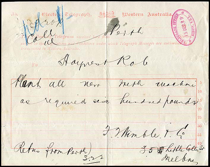 Has scarce rubber TELEGRAPH OFFICE triple oval (RO6-TO) date stamp in pink (2nd earliest use recorded).