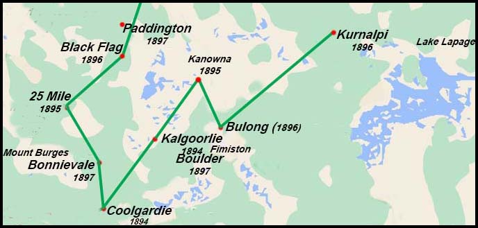 | This map extends through 25 Mile to Goongarrie (90 Mile) and Menzies. | This map extends east along the inter-colonial telegraph line to: