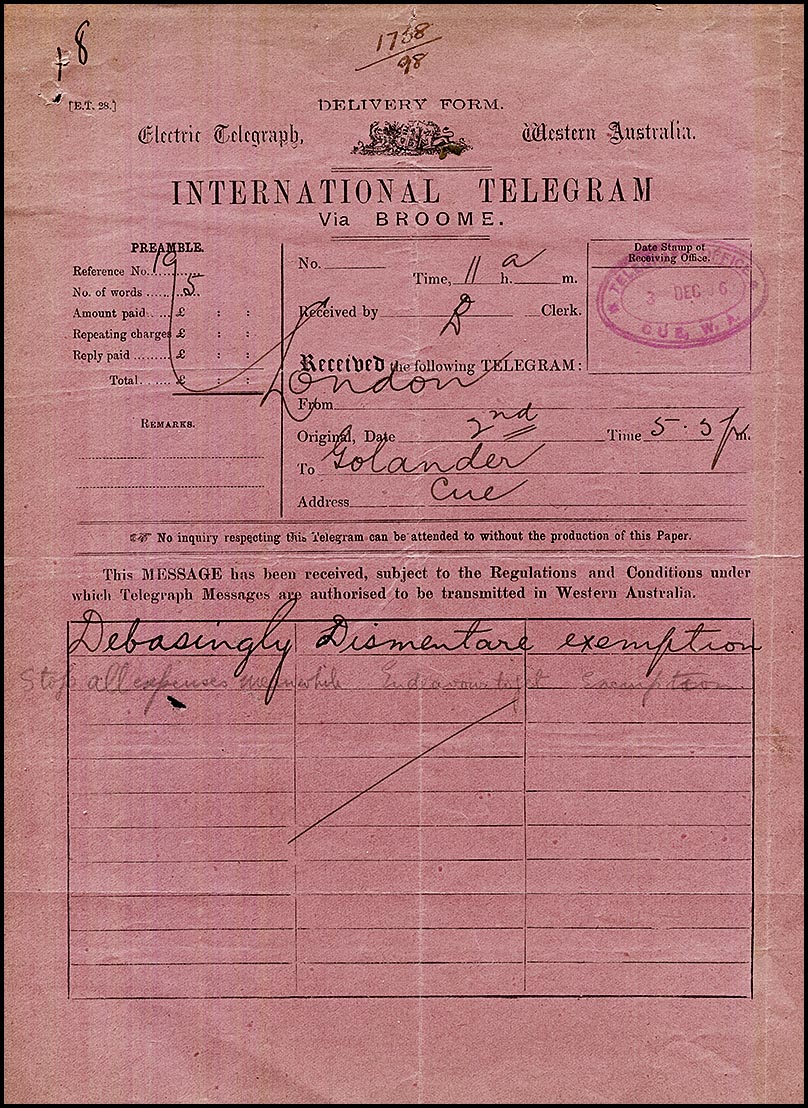 | Heading and notes: | Form No. E.T. 28 (?). DELIVERY FORM above Crest which is spanned by ELECTRIC TELEGRAPH ___ WESTERN AUSTRALIA. |