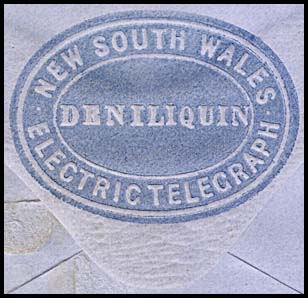 1. Wagga Wagga was one of the 29 Telegraph Offices included in the special printings of delivery envelope NC-EO-3 by de la Rue in 1858 These envelopes incorporated an embossed oval seal on the rounded flap of the envelope with NEW SOUTH WALES at the top and ELECTRIC TELEGRAPH at the base. The office name was embossed across the centre of the seal.