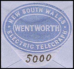 Wentworth was one of the 29 Telegraph Offices included in the special printings of delivery envelope NC-EO-3. These envelopes incorporated an embossed oval seal (EO6-ET) on the flap of the envelope with NEW SOUTH WALES at the top and ELECTRIC TELEGRAPH at the base. The office name was embossed across the centre of the seal.