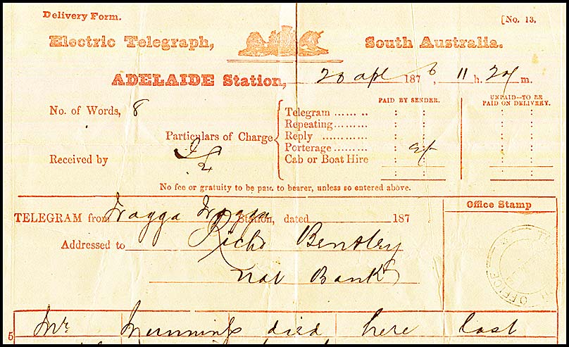 2. a South Australian delivery form (SC-DO-4A) used to record a message sent from Wagga Wagga to Adelaide Station on 20 April 1876.