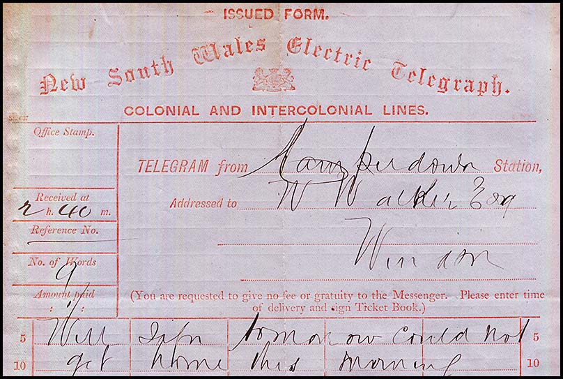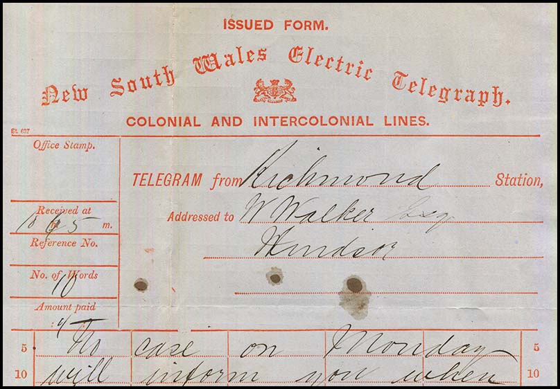 The earliest recorded use of a telegram at Balmain is a transmission form for a message sent from Balmain to Cullen's Railway at Moss Vale on 9 January 1877 (NC-TO-3).