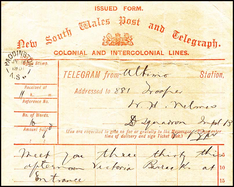 The earliest indication of the operation of the Ultimo Telegraph Office is a delivery form (NC-DO-10Bb) used for a message from Ultimo to Paddington (Barracks) on 16 July 1901.