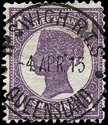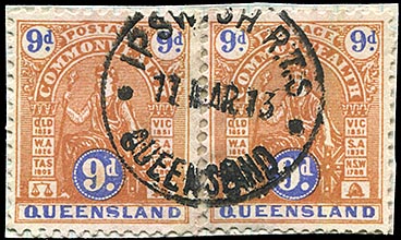 This pair of stamps was cancelled with two strikes in light blue of a TELEGRAPH OFFICE TOOWOOMBA date stamp