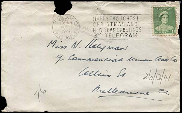 HAPPY THOUGHTS! CHRISTMAS AND NEW YEAR GREETINGS BY TELEGRAM. Datestamp: Circle (diameter: 22 mm). Base inscription: VIC. AUST. Characteristics: Only recorded date of this format: Number in the Census: 2. |