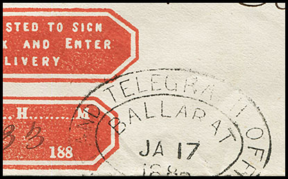 | Ordinary postal date stamps were also used on telegrams and delivery envelopes - especially after 12 June 1879 when the Post and Telegraphs Department issued an official instruction that all telegrams for delivery should be marked with a date stamp of the receiving office..