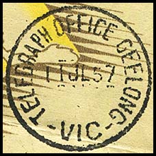 A telegraph connection was opened to the Geelong Race Course on 1st or 2nd February 1879: "This is a boon which will be appreciated by thousands of persons who take an interest in the events run for on the Geelong course. It is expected that the line will be ready for use on the 1st and 2nd February, the days of the annual race gathering of the local club" That Telegraph Office at the Racecourse must have closed at some time for it is recorded as reopening about 1933 then closing about 1940. No information about a date stamp is available. |