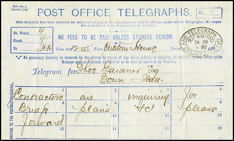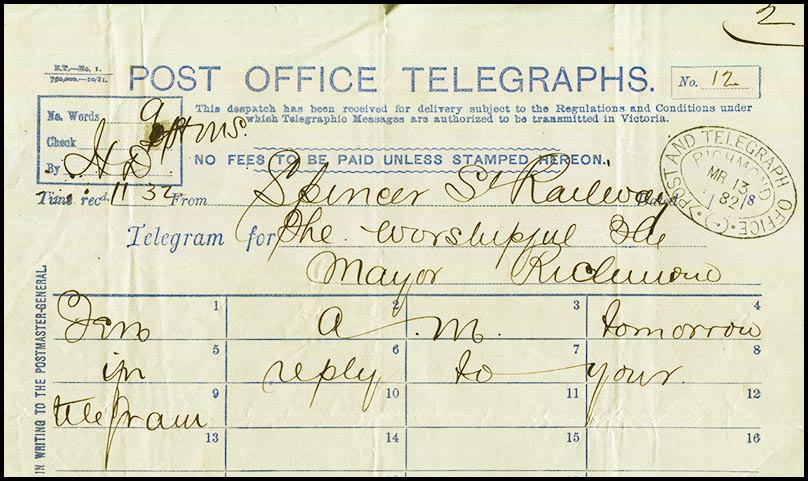 Early use. The earliest evidence of the operation of the Spencer St Railway Telegraph Office is a telegram delivery form (VC-DO-10A) used for a message transmitted from Spencer Street to Richmond on 13 March 1882. |