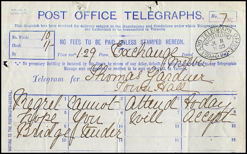 The earliest evidence of the operation of the Exchange Telegraph Office is a telegram delivery form (VC-DO-9) recording a message transmitted from the Exchange to Richmond on 8 July 1880. |