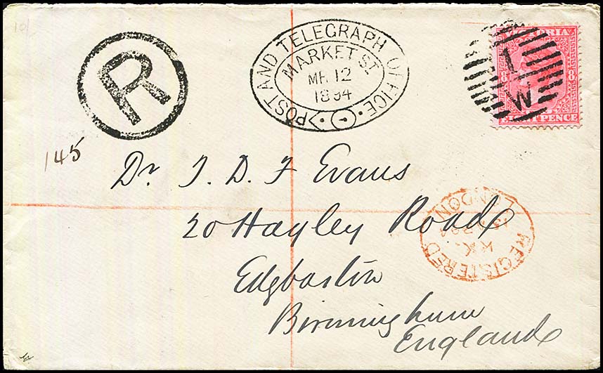 ![]() 6 April 1894 (latest recorded date). One of three covers with a Belt & Buckle sent to an overseas destination - see also Horsham and Market Street below. |