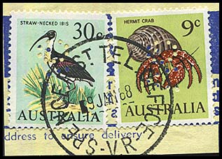 ![]() 9 January 1968 (latest recorded date). Cancelling 30c Ibis and 9c Hermit Crab (both punctured VG) on piece of telegram form. |