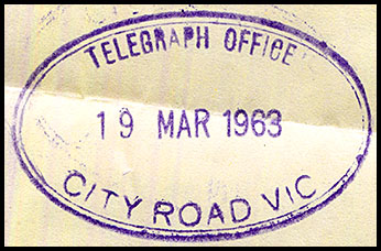 No special date stamp inscribed TELEGRAPH was issued the this office. Instead a duplex was used. It has MELBOURNE in the right half rather than the usual numeral.
