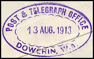 The Post Office at Dowerin opened on 1 September 1906. It became an Official Office (with Telegraph facilities) on 1 July 1912.