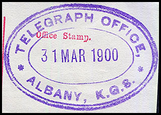 | 1. The Office was however issued with at least four rubber TELEGRAPH OFFICE date stamps. 1. The first was a rubber oval date stamp (RO6- TO) inscribed TELEGRAPH OFFICE/ALBANY K.G.S.: