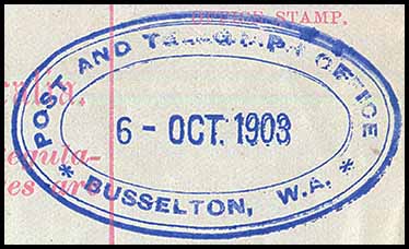 ![]() Telegram sent from Quindalup to Busselton on 6 October 1903. Has a magnificent rubber oval date stamp for Busselton - the earliest recorded. |