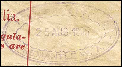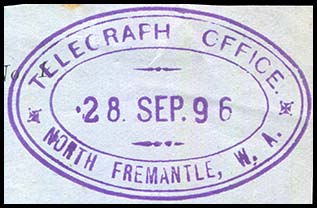 The West Australian of 2 July 1894 reported "A petition signed by 70 residents of Beaconsfield was forwarded to the Postmaster General a fortnight ago, asking that a Post Office be established in that suburb. The petitioners pointed out that there were over 300 houses in the district, and that the only postal facility enjoyed was a pillar box in Hampton Street which was only cleared at 6 o'clock each morning. There were, however, three or four deliveries. The Postmaster General has replied stating that the establishment of a Post Office at Beaconsfield has been decided upon and he has arranged with Mr.L. J.Stirling, the Postmaster at Fremantle, to select a suitable site for the building. Mr. Stirling will probably report in a few days". A Post & Telegraph Office was opened at Beaconsfield on 1 August 1894. The Western Mail of 4 August reported "A Post and Telegraph office having been opened at Beaconsfield, the principal southern suburb of Fremantle, Mr. E. Solomon, M.L.A. on Wednesday sent the following telegram to the Postmaster -General. "Thanks from people of Beaconsfield for the establishment of Post and Telegraph Office". The Postmaster-General replied: "I congratulate you and the inhabitants of Beaconsfield upon the establishment of a Post and Telegraph Office in your rising suburb and am very pleased to have been able to assist in providing such a long felt want". The people of Beaconsfield who now number over 500 persons, express much satisfaction at the provision of postal and telegraph conveniences in their midst". It changed name to South Fremantle on 1 April 1904. There is no record of a date stamp being issued to the Office for use with Telegraphs. |