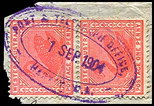 ![]() 10 March 1908. Used on WI-DO-2Aa. Also shows a BUNBURY office hand stamp |
