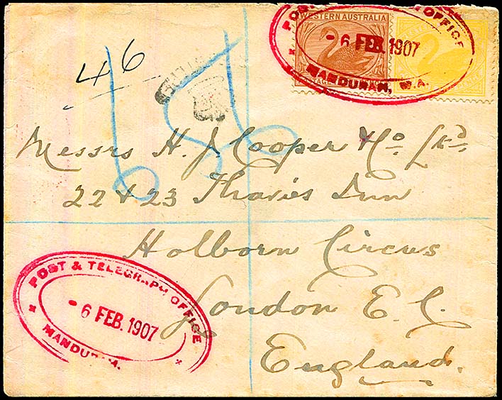 ![]() Cover from Mandurah to England 6 February 1907 with two strikes of the Mandurah oval RO6 - P&TO. |