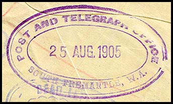 ![]() 15 September 1905. On reverse side of an OHMS cover sent from the Office of Titles to South Fremantle. |
